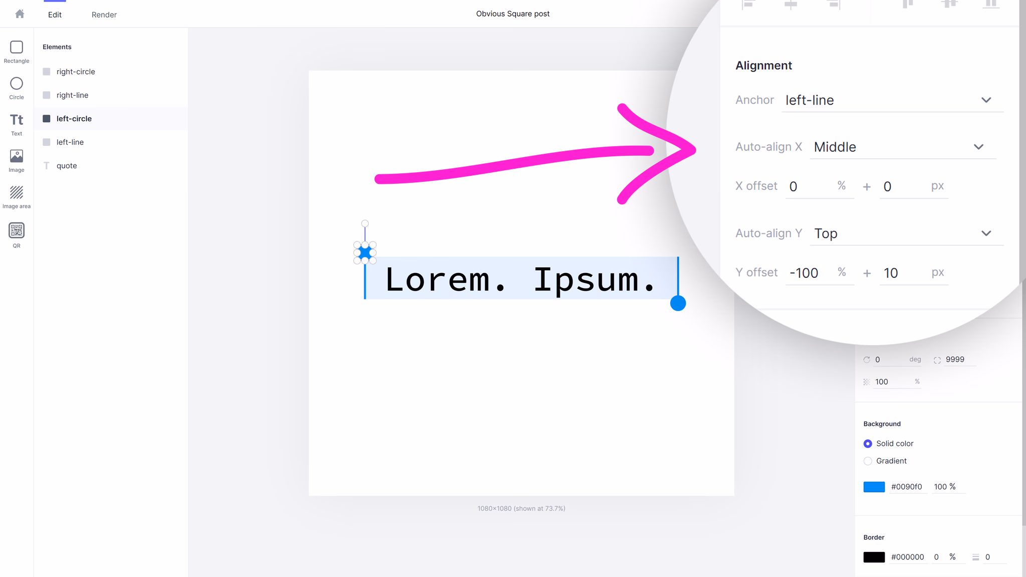 To help you create a truly dynamic design, the Robolly template editor has a feature called auto‑alignment. What it does, is positions a given element automatically based on other elements in the template. This is useful for example when you have a text element whose height and width may dynamically change based on the data passed into the template.
