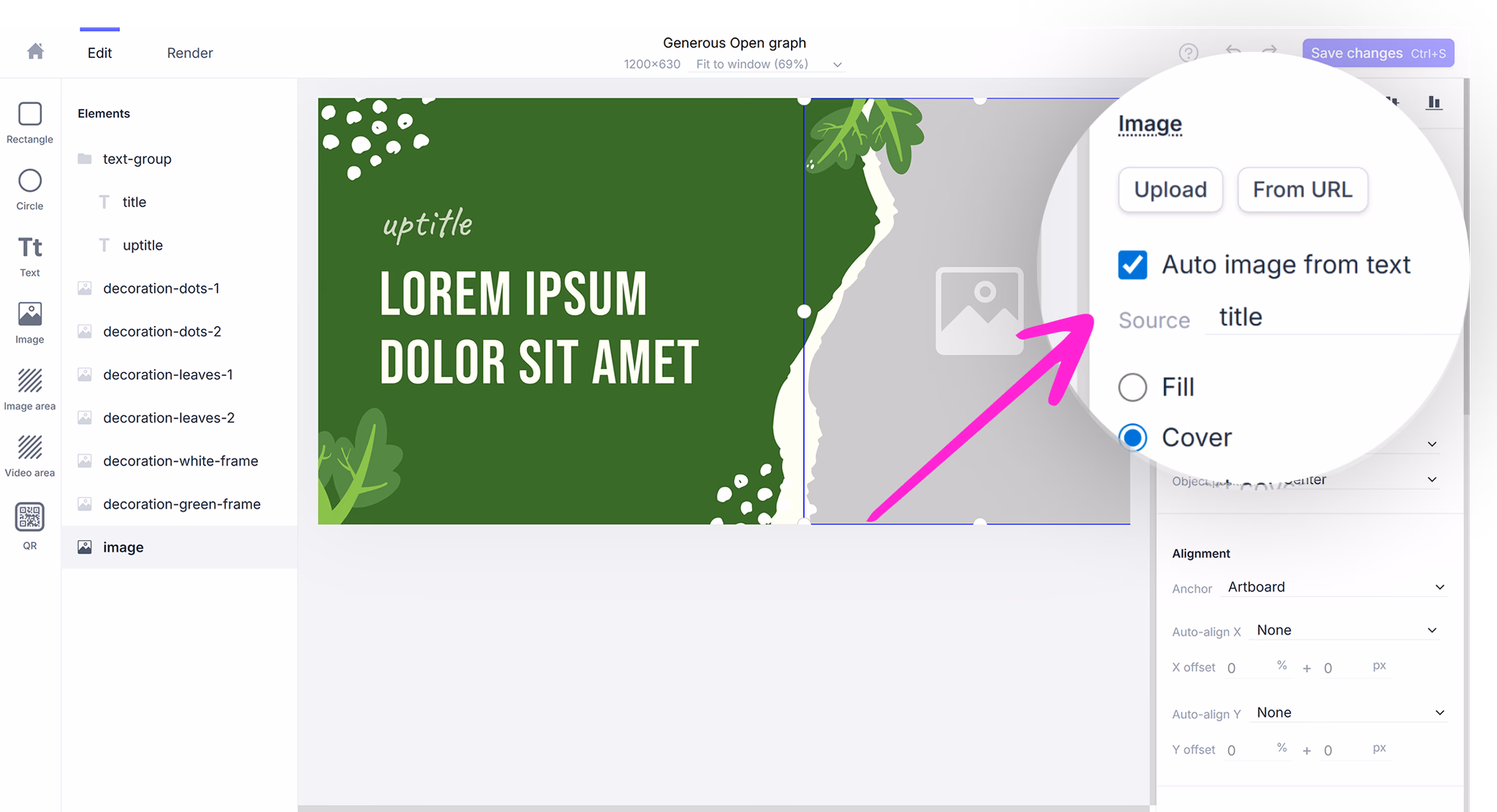 Auto image from text is available for all image elements in the Robolly editor. To enable it, select your image element and check the Auto image from text option in the right panel. Then select the text element to use as the image source.
