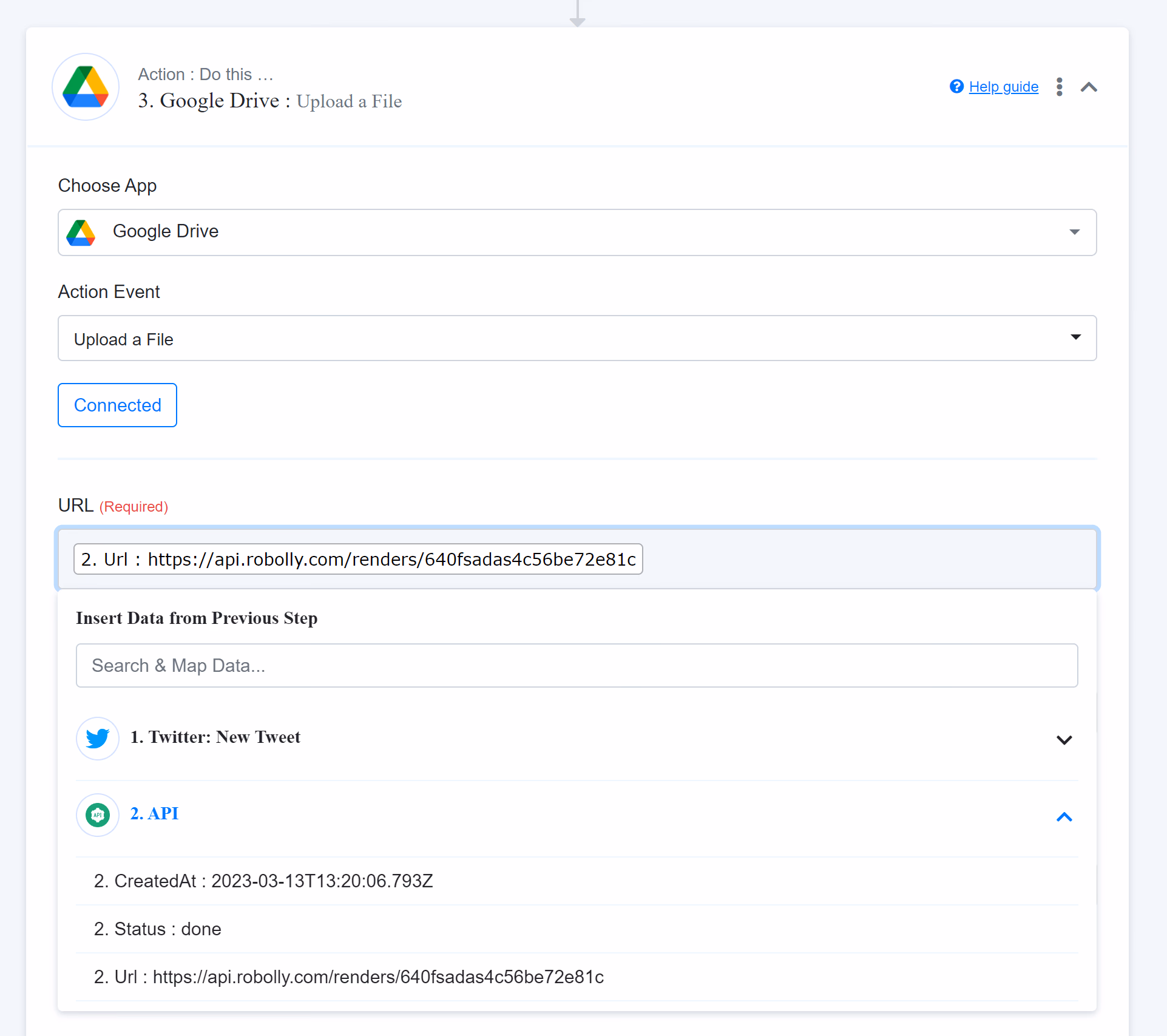 parameter. In the screenshot below, you can see example how upload the rendered file onto a Google Drive. Other actions, like posting to social media will be similar where you choose the url