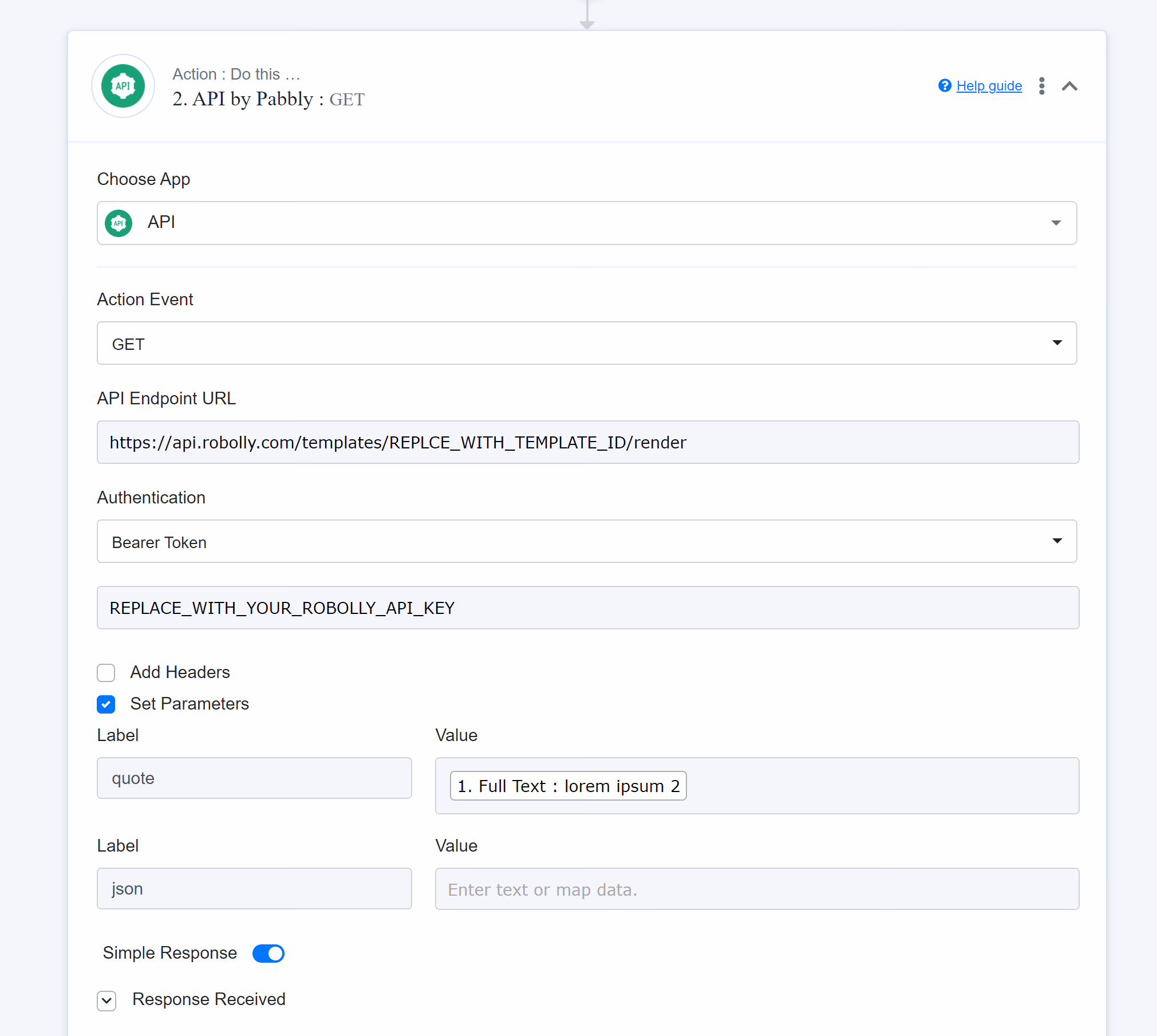 - Then, set up Pabbly to create a GET request to the render link, and Robolly will return the image.