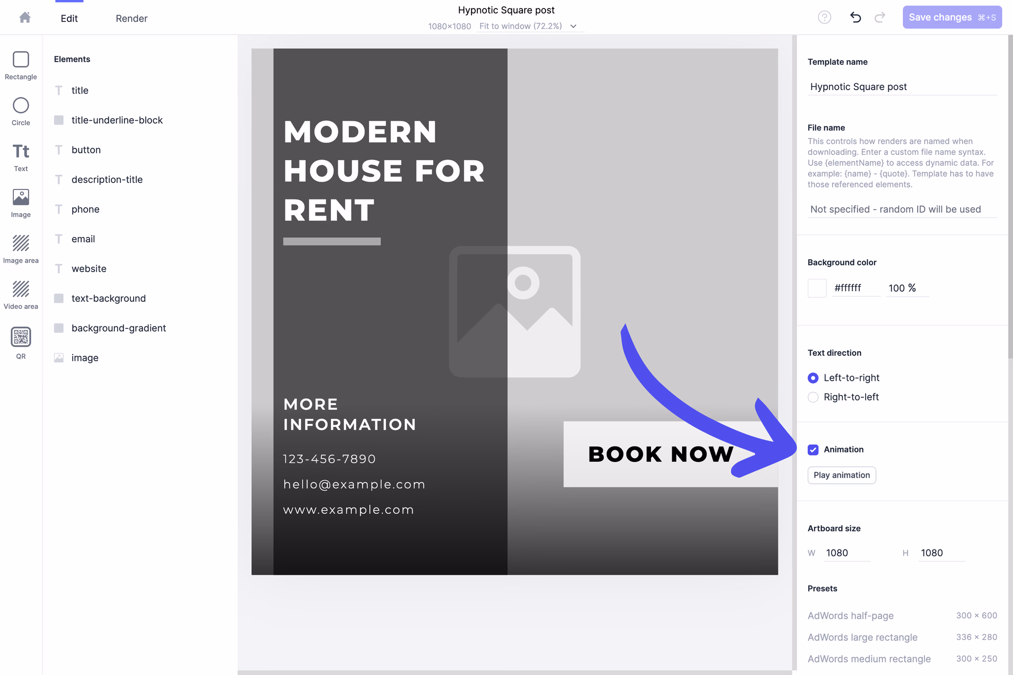 Bring your static images to life by adding eye-catching animations. Re-use your current templates or create a new one using the Robolly template editor.