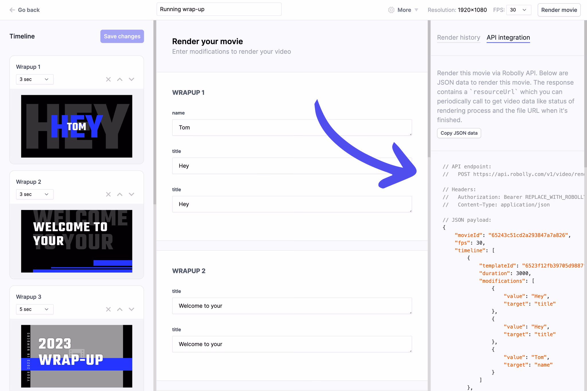 As always, you can fully automate the process of creating your videos from your code or via automation tools like Zapier, Pabbly Connect, or similar. TIP: When rendering via API you can access features like setting up custom template duration for each render, changing modifications in time, etc. Read API reference for more information.
